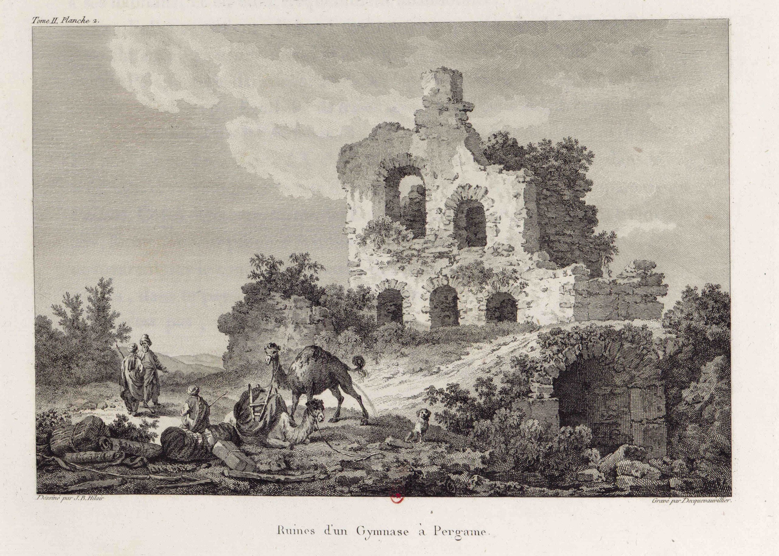« On a peint ce qu’on a vu, et on l’a peint avec amour » déclare le comte de Choiseul-Gouffier dans le prospectus du Voyage pittoresque de la Grèce. Cela pose la question, abordée dans le premier axe, de ce que les voyageurs voient effectivement, mais aussi celle de la manière dont ils le restituent « avec amour ». Un questionnement autour de la mise en scène de l’architecture dans les voyages pittoresques permettra ainsi de s’emparer de corpus graphiques plus ou moins connus et de créer des ponts avec d’autres ensembles issus des livres d’architecture, d’histoire naturelle (où le bâti est parfois présent en tant que décor ou élément de contexte, comme dans les Tabulae sceleti… (1747) d’Albinus et Wandelaar), de fiction (tel le Voyage du jeune Anacharsis de l’abbé Barthélémy), ou avec l’œuvre de dessinateurs, architectes et graveurs (Piranèse, Clérisseau, Pâris, Wailly…).