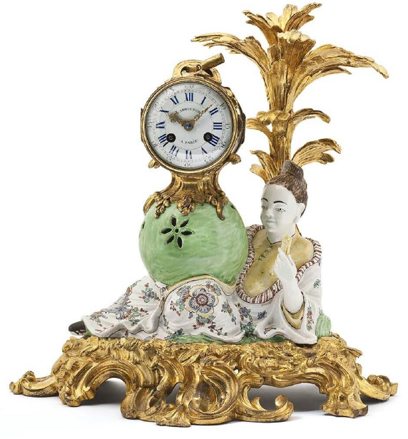 Pendule — Ladouceur (horloger), Manufacture de Chantilly Vers 1740-1750 Porcelaine tendre, porcelaine tendre moulée, décor polychrome sur couverte, bronze ciselé et doré, inv. 22757, musée des Arts décoratifs, Paris.