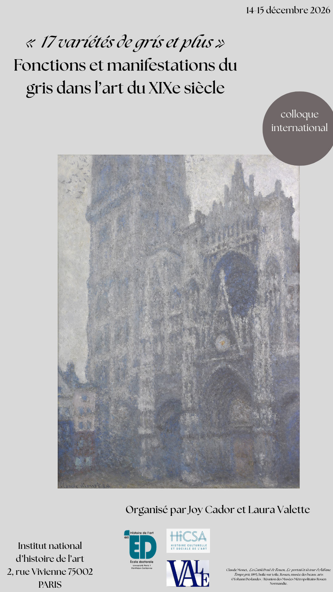 Appel à communications : « 17 variétés de gris et plus. Manifestations et fonctions du gris dans l’histoire de l’art du XIXe siècle » (Paris, INHA, galerie Colbert, 14-15 décembre 2026)