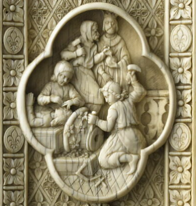 Auteur non identifié, Diptyque : la Peinture et la Sculpture (détail : La Sculpture), XIIe-XVIe siècle, ivoire, 35 × 11 cm, Paris, musée du Louvre (R 1447), en dépôt à la Fondation Salomon-de-Rothschild.© 2009 Grand Palais-RMN (musée du Louvre) / Jean-Gilles Berizzi
