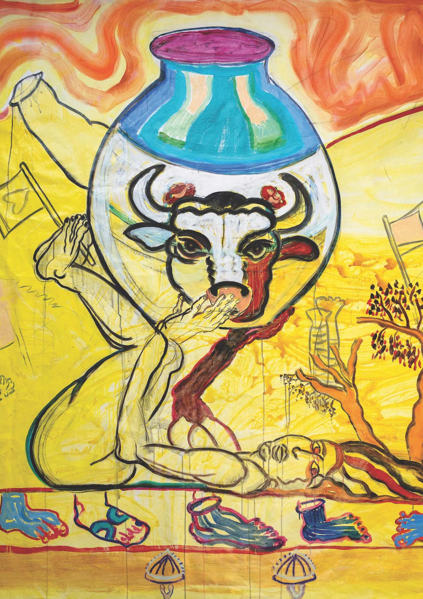 Mounira Al Solh, Danzare con il proprio mito, 2023. Carboncino, collage e olio su tela, 200 x 210 cm. Per gentile concessione dell’artista – Galleria Sfeir-Semler Beirut/Amburgo © LVAA. Foto ©Quinn Oosterbaan